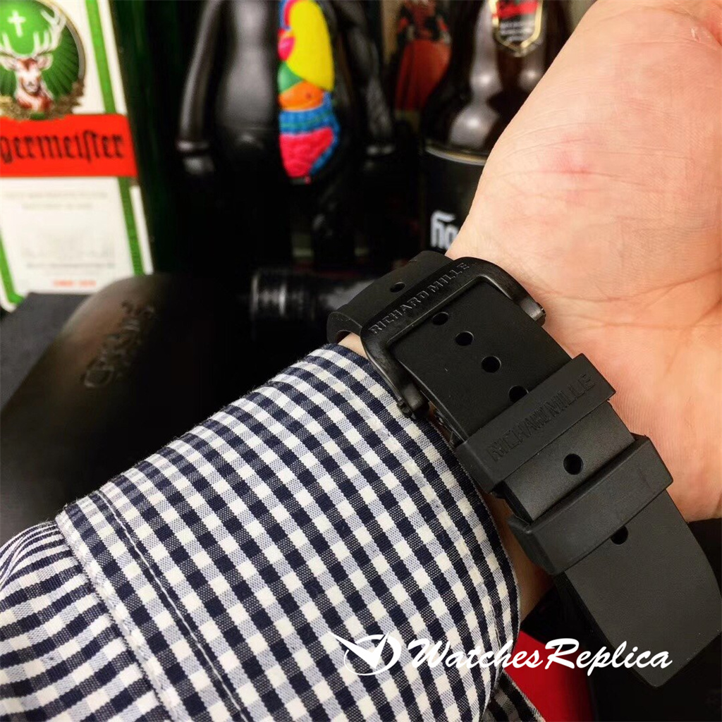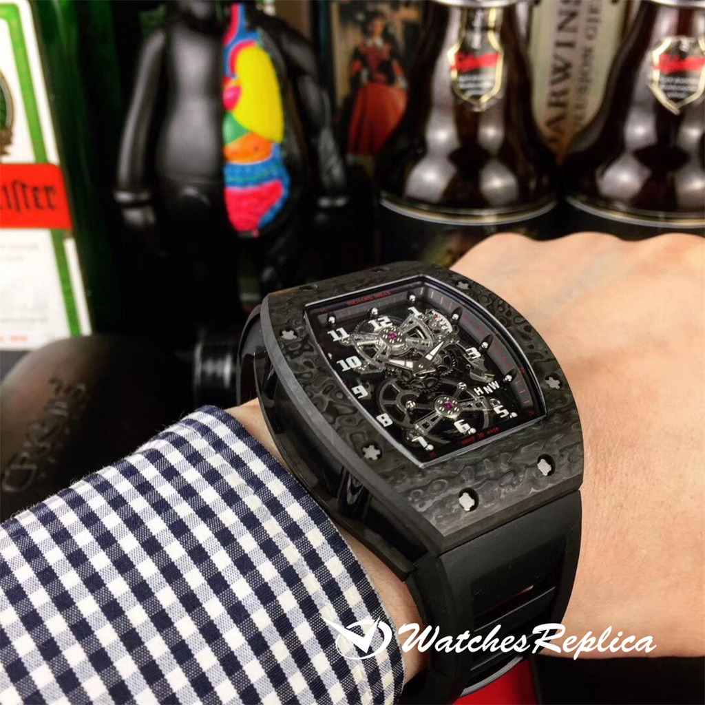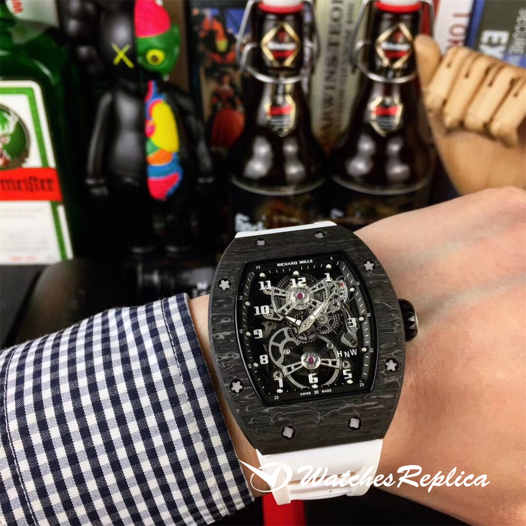 Richard Mille RM17-01 Marque Marque Emblé Case en forme de baril à vin, cadran de conception creux, avec un appareil Tourbillon, la plaque de pont de mouvement est finement polie, avec une conception de ligne moderne, une beauté très mécanique. La sangle est en caoutchouc, qui est plus adaptée à la peau et facile à prendre en charge en été.