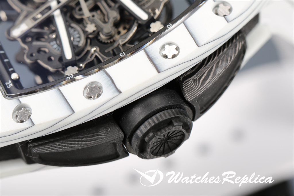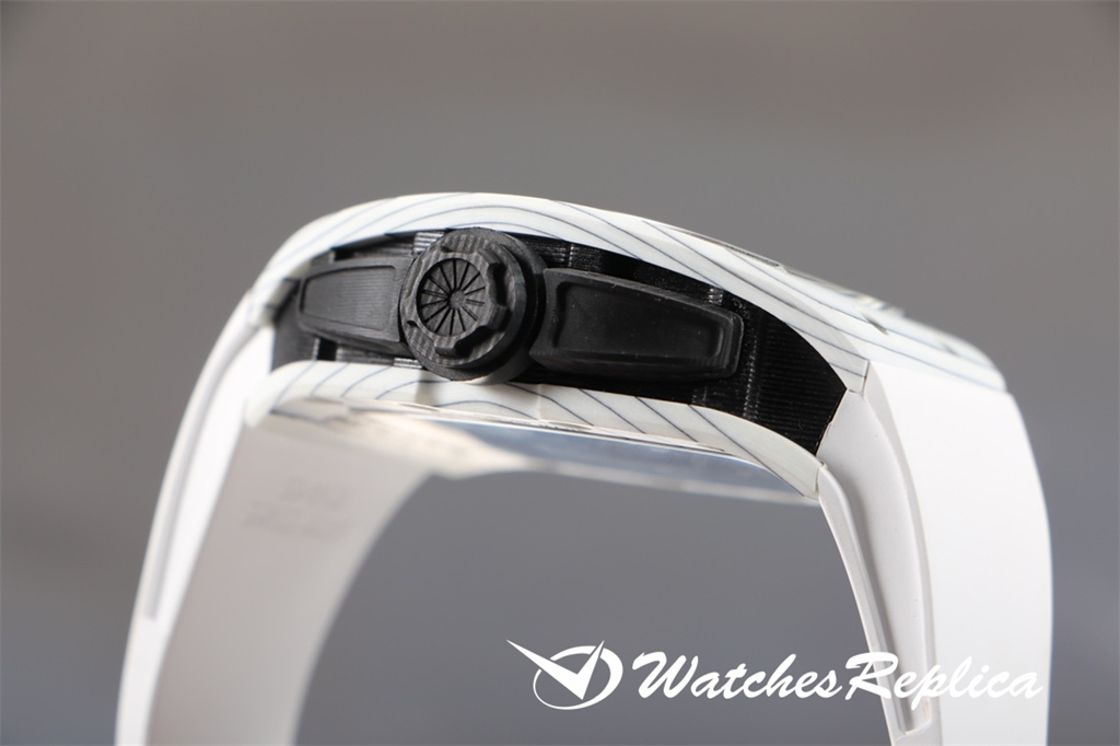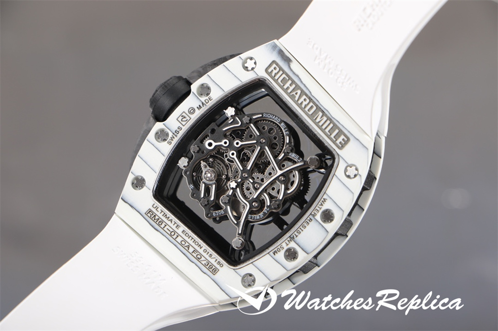 Richard Mille-Full Carbon Fibre « RM 61-01 Ultimate Track » Transmet la puissance et la vitesse, tout en poursuivant les avantages de la super-lumière et de la résistance à un super impact. La longueur maximale du boîtier est d’environ 51 mm, de largeur 42 mm et d’épaisseur de 15 mm; Le cas de conception asymétrique permet à l’étui de s’adapter au poignet de plus près sans friction avec le poignet pendant l’exercice intense comme le sprint; Le nouveau travail utilise de la fibre de carbone et du quartz en fibre, dans le processus de fraisage et de tournage, le boîtier formera une texture naturelle et unique, donc chaque montre est unique. Le protecteur de la couronne en fibre de carbone peut empêcher que la couronne soit endommagée pendant les sports. Le cadran entièrement ouvert est équipé d’une grande disposition à trois mains. Deux ponts incurvés traversent le cadran et transportent la structure du mouvement. De l’avant du cadran, vous pouvez observer directement les deux barils et le train d’enroulement. Le mouvement est évidé sur une grande zone. Frais.