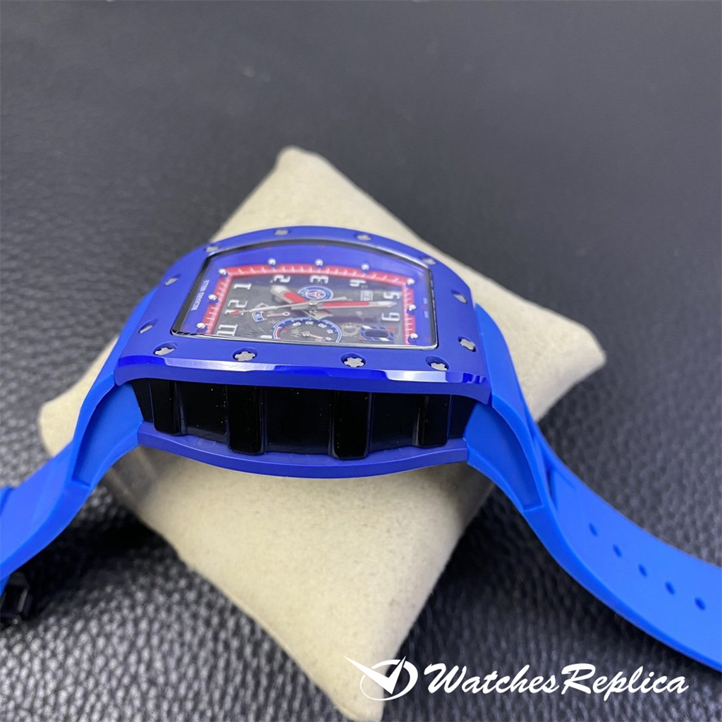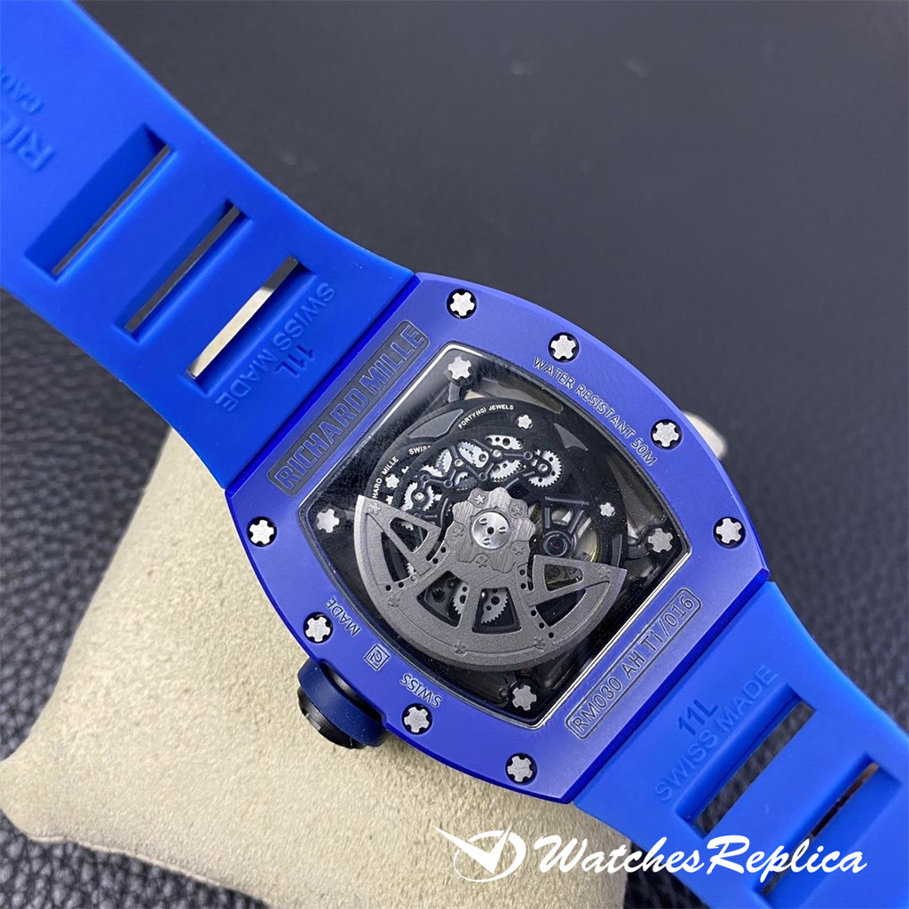 Richard Mille RM030 « Paris » Paris Saint-Germain Special Edition Watch, Paris, France Limited 100 Céramiques et NTPT La fibre de carbone, les céramiques sablées au bleu foncé ATZ forment les cadres avant et arrière du RM030 « Paris », et assorti avec une sangle bleu foncé, en contraste vif avec le NTPT blanc Anneau de montre en fibre de carbone et couronne. La fonction est la même, la taille de la coque est de 43 × 50, une reproduction parfaite! ! !