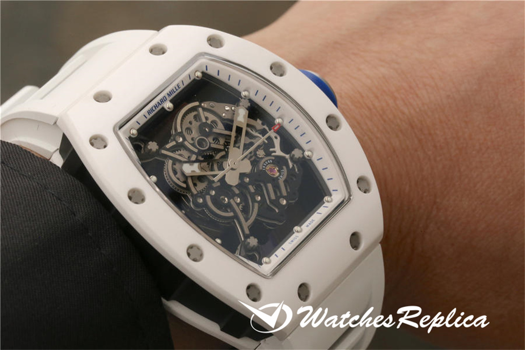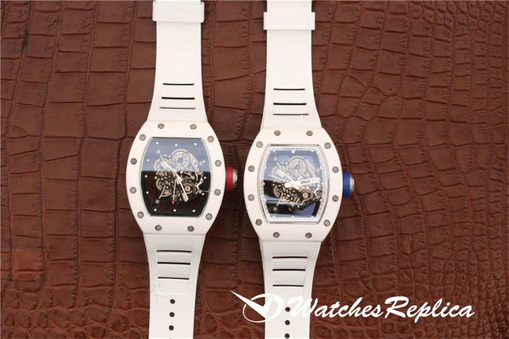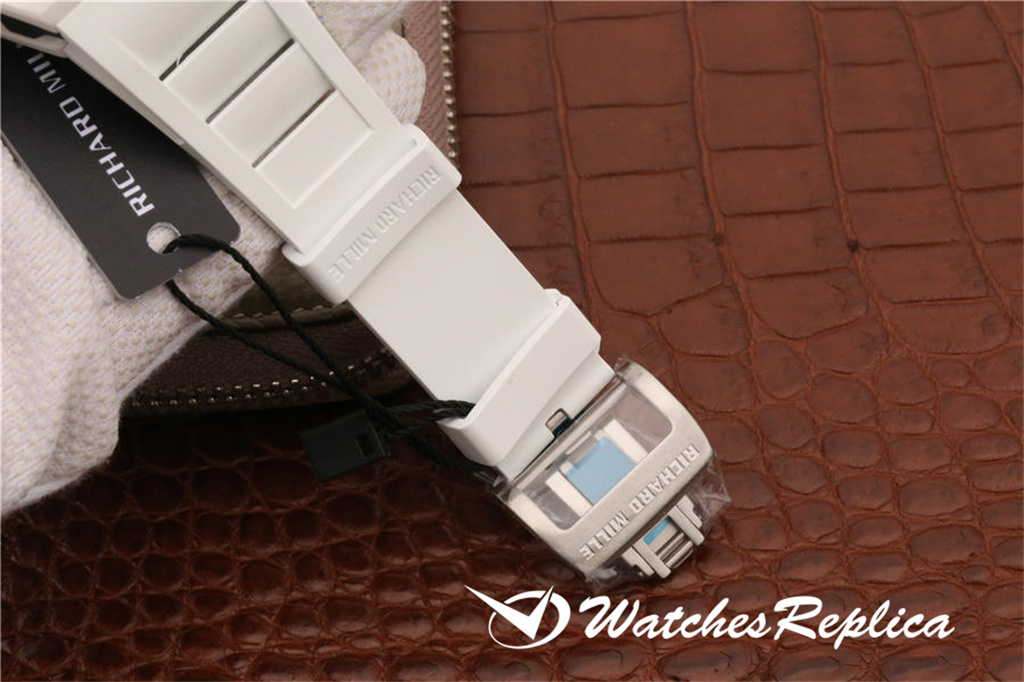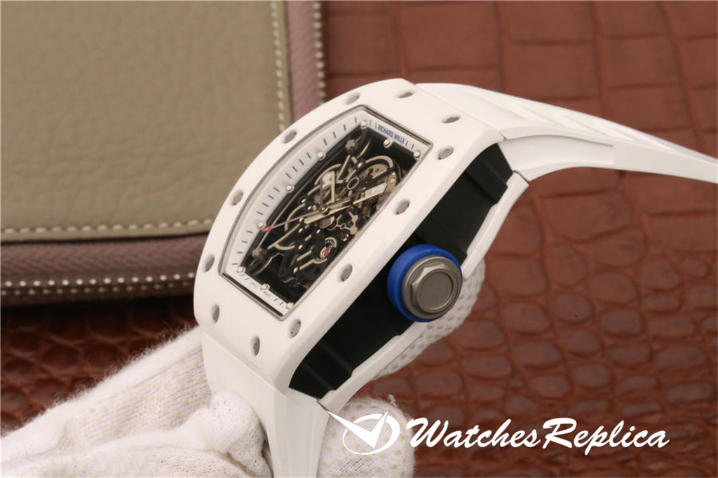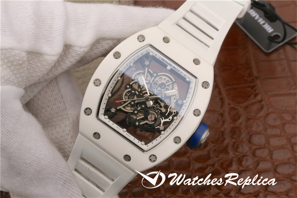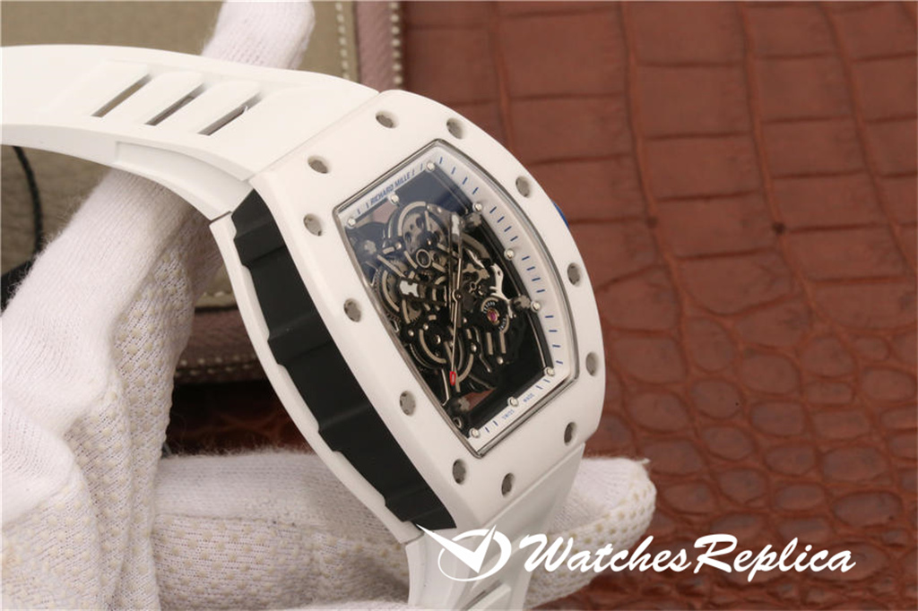 Richard Mille RM055 Ceramic Watch Classic Wine Barrel Forme Crempliaté Cremple Design, Shell Pannel et Couvreau inférieur sont en matériau en céramique trempé à haute résistance qui est plus difficile que l’acier et ne sera pas rayé par le port. La coquille du milieu de la marque est faite d’un cadran en céramique noir. Le cadran tridimensionnel creux est composé de pièces de vitesse. Les marqueurs de mains et d’heure sont tous des matériaux lumineux. Le temps peut être facilement lu même dans l’obscurité la nuit. Le miroir du saphir anti-glare est plaqué et la grande couronne est faite d’éléments de pneus de voiture. En caoutchouc L’anneau est facile à tourner et à régler. Le mouvement adopte les détails d’apparence originaux et cohérents. La sangle de sports blanches exquise a ventilé en caoutchouc avec une boucle de papillon.